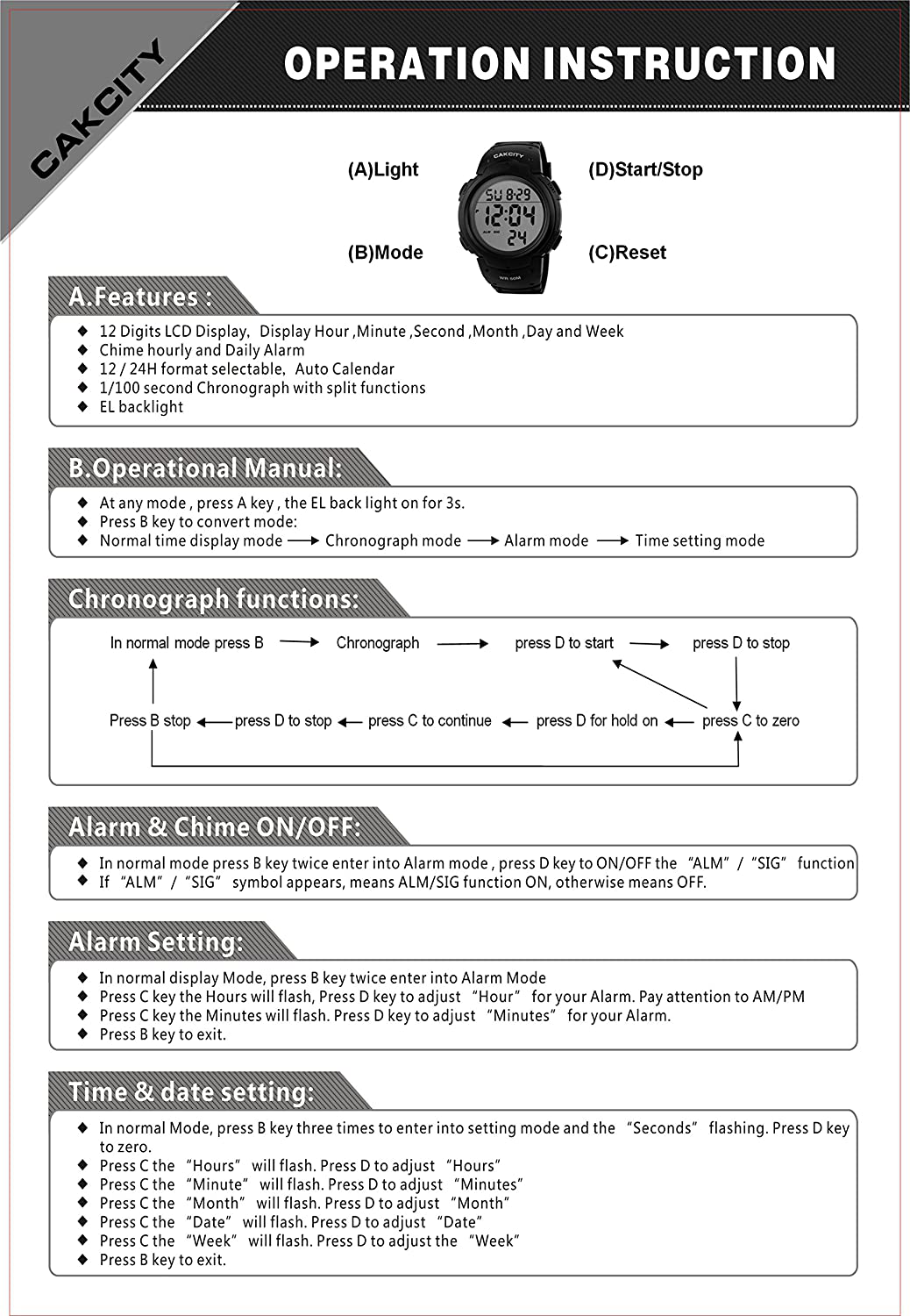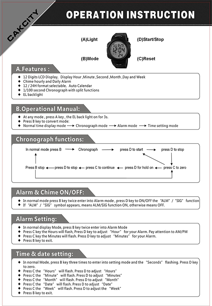 - Multifunction Watch:Auto Date,Alarm,Water Resistant,LED display,Shock Resistant,Stop Watch,Back Light