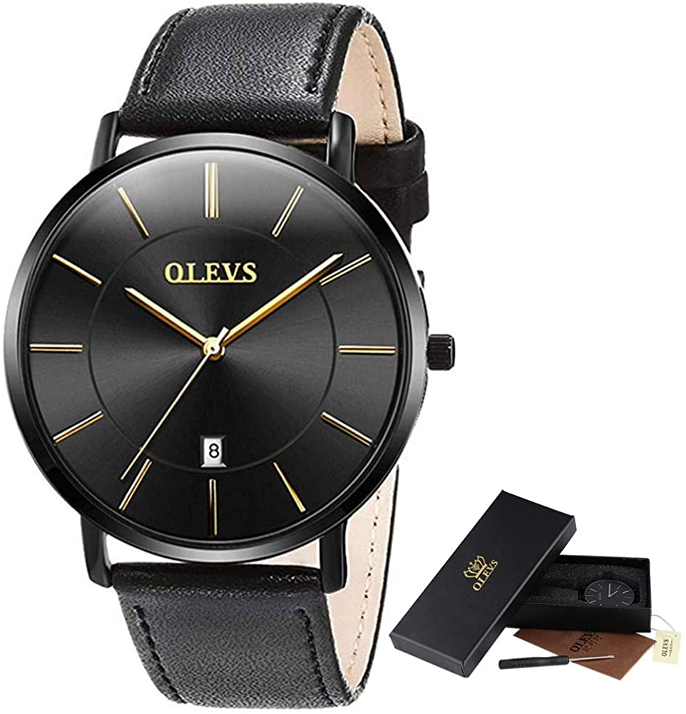 OLEVS Mens Minimalist Leather Strap Watches Brown Black Blue Leather Band Quartz Wrist Watches, Waterproof & Date Window